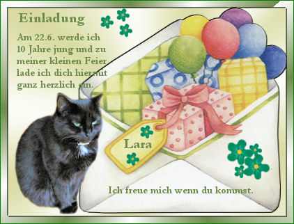 10.07.2010 wir sind zur Geburtstags-Safari bei Ertix & Babsy eingeladen und haben Andenken bekommen 12.06.2010 Wir haben eine Einladung zu Laras 10. Geburtstag bekommen und freuen uns schon auf die Feier 22.05.2010 Wir wünschen allen unseren lieben Internetfreunden ein sonniges Pfingstfest. Wer möchte Wir bedanken uns auch bei euch für die lieben Freunden, für die Pfingstgrüsse und Geschenke, die ihr uns 13.03.2010 unsere Osterseiten sind wieder online, jetzt unter neuer URL www.goldelfe.de/ostern oder auf den Banner klicken und das erste Ostergeschenk findet ihr 05.03.2010 ich war auf der Geburtstagsparty von Chelsea und habe vom Suchspiel den Preis eingeheimst ;-) 14.02.2010 Wir wünschen allen unseren Freunden einen schönen Valentistag. Wer möchte, kann sich ein Bildchen 11.02.2010