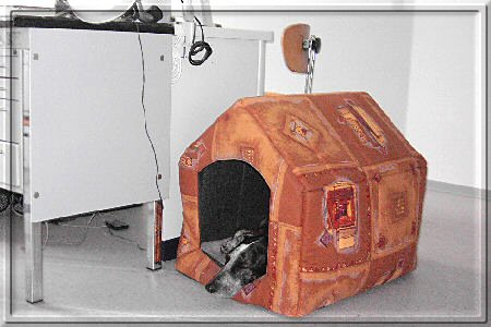 Sie hat mir exrta bei ebay ein Häuschen gekauft und das steht neben ihrem Arbeitsplatz. Es ist aus Stoff und ich kann darin liegen und schlafen. Meistens sitzt mein Frauchen alleine in dem Raum oder mit ihrer Kollegin, die eigentlich Angst vor mir hat. Sie hat sich aber schon sehr gut an mich gewöhnt und streichelt mich auch. Die anderen Kollegen sind auch alle ziemlich nett zu mir. Früher durfte ich durch das ganze Dental-Labor laufen, aber seit ich mal die Tasche von Melanie durchsucht habe und dabei ihre Butterbrote gefunden und alle aufgefressen habe, darf ich nicht mehr rumlaufen. Sehr schade, denn die anderen haben auch alle was zu essen mit, das könnte ich doch auch finden. Die eine Mitarbeiterin bringt mir immer was Leckeres mit, mal ein Kaustreifen oder auch schon mal ein Stück Pansen oder Schweineöhrchen, dann schimpft Frauchen mit ihr, weil der ganze Raum dann danach stinkt, aber ich finde es toll und kann bei dem Duft noch besser schlafen.