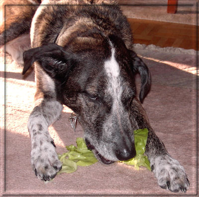 Ein paarmal habe ich auch schon Kartoffeln oder Nudeln bekommen und einmal habe ich sogar Schrimps probiert, die waren runtergefallen. Überhaupt wenn Frauchen kocht, bin ich immer dabei, denn öfters fällt da was runter und so schnell kann sie das gar nicht aufheben, wie ich es gefunden habe. Nur Zwiebeln mag ich nicht. Spinat ist auch sehr lecker mit Fisch zum Beispiel. Ja, Frauchen kocht auch richtig für mich, so Hähnchenherzen und -mägen oder Rinderherz, das mag ich gerne. Dazu gibt es dann Möhren und Porree und eine Möhre bekomme ich roh, die knackt so toll und schmeckt richtig gut. Sie macht dann immer einen Riesentopf voll und friert mir das portionweise ein, dazu gibts Nudeln oder Milchreis, manchmal auch Kartoffeln. Aber auch Dosenfutter bekomme ich und das schmeckt auch gut. So für heute muß ich aber Schluß machen, Frauchen schält gerade einen Apfel und Du weißt jetzt sicher was das für mich bedeutet............