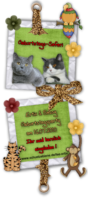 10.07.2010 wir sind zur Geburtstags-Safari bei Ertix & Babsy eingeladen und haben Andenken bekommen 12.06.2010 Wir haben eine Einladung zu Laras 10. Geburtstag bekommen und freuen uns schon auf die Feier 22.05.2010 Wir wünschen allen unseren lieben Internetfreunden ein sonniges Pfingstfest. Wer möchte Wir bedanken uns auch bei euch für die lieben Freunden, für die Pfingstgrüsse und Geschenke, die ihr uns 13.03.2010 unsere Osterseiten sind wieder online, jetzt unter neuer URL www.goldelfe.de/ostern oder auf den Banner klicken und das erste Ostergeschenk findet ihr 05.03.2010 ich war auf der Geburtstagsparty von Chelsea und habe vom Suchspiel den Preis eingeheimst ;-) 14.02.2010 Wir wünschen allen unseren Freunden einen schönen Valentistag. Wer möchte, kann sich ein Bildchen 11.02.2010