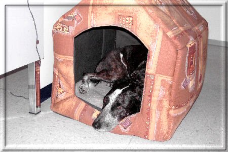 Sie hat mir exrta bei ebay ein Häuschen gekauft und das steht neben ihrem Arbeitsplatz. Es ist aus Stoff und ich kann darin liegen und schlafen. Meistens sitzt mein Frauchen alleine in dem Raum oder mit ihrer Kollegin, die eigentlich Angst vor mir hat. Sie hat sich aber schon sehr gut an mich gewöhnt und streichelt mich auch. Die anderen Kollegen sind auch alle ziemlich nett zu mir. Früher durfte ich durch das ganze Dental-Labor laufen, aber seit ich mal die Tasche von Melanie durchsucht habe und dabei ihre Butterbrote gefunden und alle aufgefressen habe, darf ich nicht mehr rumlaufen. Sehr schade, denn die anderen haben auch alle was zu essen mit, das könnte ich doch auch finden. Die eine Mitarbeiterin bringt mir immer was Leckeres mit, mal ein Kaustreifen oder auch schon mal ein Stück Pansen oder Schweineöhrchen, dann schimpft Frauchen mit ihr, weil der ganze Raum dann danach stinkt, aber ich finde es toll und kann bei dem Duft noch besser schlafen.