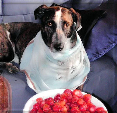 Eigentlich bin ich ein ausgesprochener Allesfresser. Was ich so draußen finde, nehme ich ganz schnell zu mir, damit es keiner merkt. Wenn es aber doch einer merkt und das ist meistens der Fall, gibt es immer Ärger, denn ich darf das ja nicht. Dann ist ein lautes Getöse wie: Lucky mach aus oder auch nur aus aus zu hören. Wenn ich dann wirklich alles wieder ausspucke und das mache ich oft, um ihnen zu gefallen, dann gibt`s immer ein Leckerchen. Früher, als ich noch klein war, hab ich immer ganz schnell gefressen, heute weiß ich, das sie mir mein Essen nicht abnehmen und da geht`s auch etwas langsamer. Besonders gerne mag ich alle möglichen Sorten von Obst, das kommt daher, wenn Frauchen etwas ißt, wie Banane oder Tomate oder so, gibt sie mir immer das letzte Stückchen. Als ich noch ziemlich klein war gabs mal zum Nachtisch frische Erdbeeren und als keiner hingesehen hat, hab ich mit beiden Vorderfüssen in der Schüssel, die auf dem Tisch stand, gestanden und Erdbeeren probiert. Die waren klasse und als sie es bemerkt haben (viel zu schnell) konnten sie erst gar nicht schimpfen vor lauter Lachen.